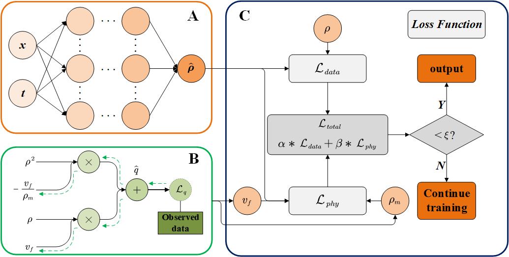 在国家自然科学基金基础科学中心项目、杰出青年基金项目、优秀青年基金项目和青年基金项目(批准号:72288101, 71825004, 72122003, 72201029)资助下,ok138太阳集团古天乐高自友教授团队针对稀疏数据场景下的道路交通状态估计问题开展研究,设计了基于物理信息深度学习(Physics-informed deep learning, PIDL)的交通状态(速度和密度)估计框架。该成果以“Physics-informed deep learning for traffic state estimation based on the traffic flow model and computational graph method”为题,于2023年发表在《Information Fusion》期刊上,论文链接: https://doi.org/10.1016/j.inffus.2023.101971。